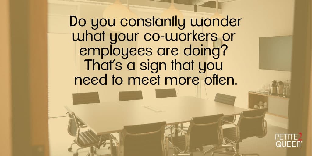 Some things really do need to be discussed in an in-person or virtual meeting; simple emails won’t do. Emailing back and forth often takes too long or will lead to too much confusion. Instead of sending 20 emails, take a few minutes to talk it out. Do you constantly wonder what your co-workers or employees are doing? That’s a sign that you need to meet more often.