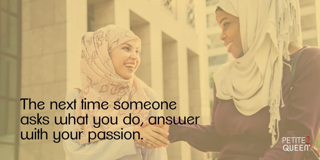 Your job and your passionate work may be two separate things. Your job may give you financial security, whereas your passion hasn’t become lucrative yet. That doesn’t mean you have to keep your passion a secret! You might be a musician playing a few gigs a month, but your job as a receptionist at a hotel is what pays the rent. At social functions, tell people about your passion. It doesn’t matter if you haven’t achieved fame and fortune – you love it, and you’re on the right track!